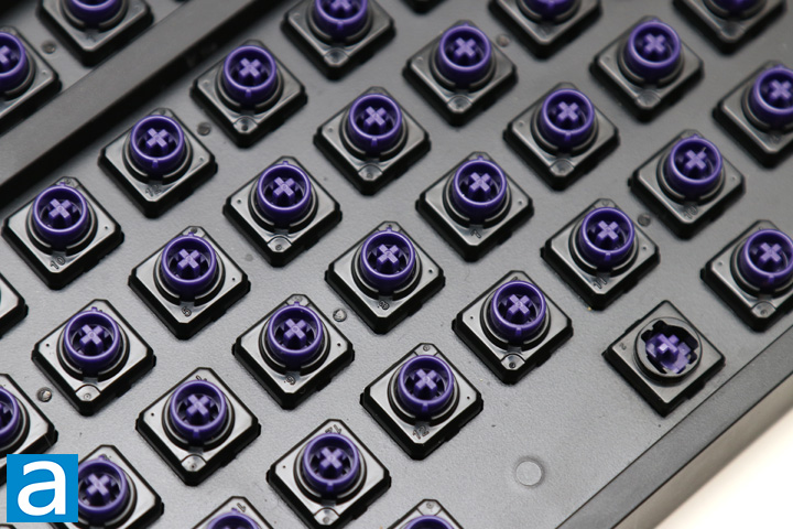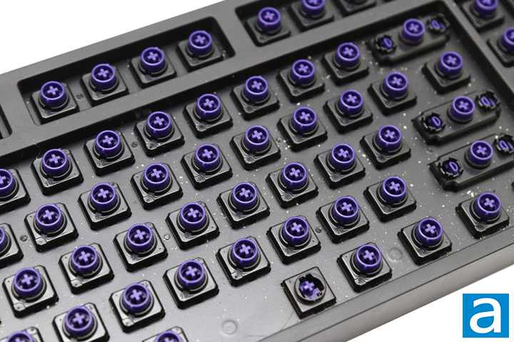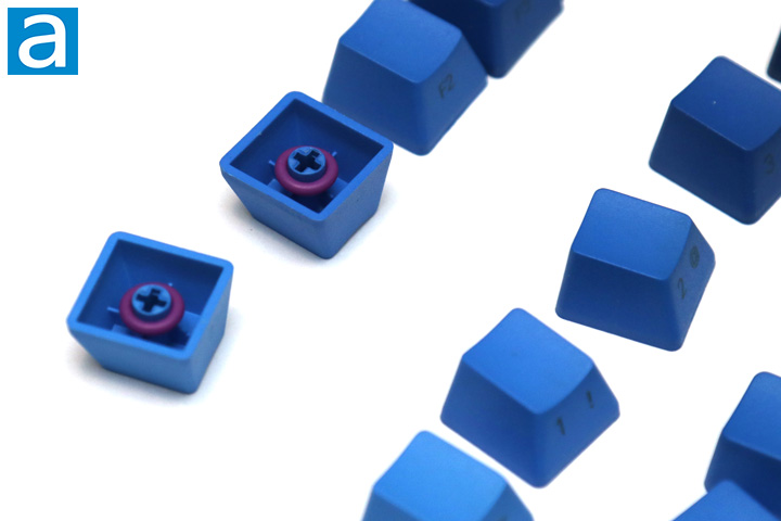 Other than swapping out the keycaps on your board, the next easy modification you can make is to add O-rings to each key. Traditionally, O-rings are found in the industrial world for sealing purposes. However, the O-ring on a keyboard is meant to dampen switch actuations, making for a softer bottoming out. I know a lot of people do like the clicky or firm bottoming out from mechanical keyboards, but others want a combination of the tactile feedback with a quieter experience. With these purple rubber rings, you can soften the keys when you completely press down. Installation of these rings are pretty straightforward, as the rings are the typical size of the stem on the keycap. Thus, you can just slip these rings on the underside of the caps. Pushing the rings down will be done automatically when you install the whole thing on the keyboard. You can also use the back end of the included brush to help. I found these O-rings to not have a whole lot of give, which means you may not notice the dampening effect right away. However, I can assure you it definitely does cushion the press overall.