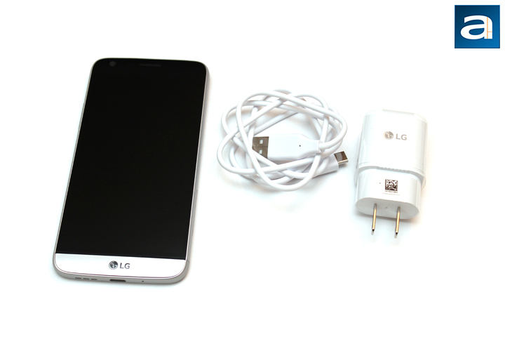Out of the box, we have the LG G5 wrapped in a plastic sleeve to protect the phone from any scratches. On the phone is also a lot of seals everywhere to protect the glossy areas, including the screen and the sides of the G5. In addition to the phone, we have a white charger, with "Fast Charge" written on top. This charger conforms with Qualcomm's Quick Charge 2.0 technology, with the ability to deliver 9.0V at 1.8A, or the more standard 5.0V at 1.8A, depending if the device plugged in works with QC 2.0 or not. I will cover this more later on in the review. Finally, we have a 1.0m white USB-C to full-sized USB with USB 2.0 speeds. I do think the cable is a tad short, but I appreciate the fact this terminates with a full-sized USB on one end, rather than USB-C connectors on both ends.