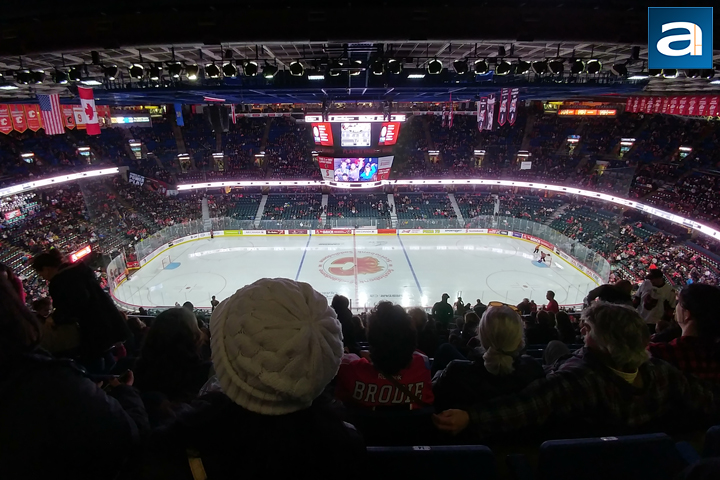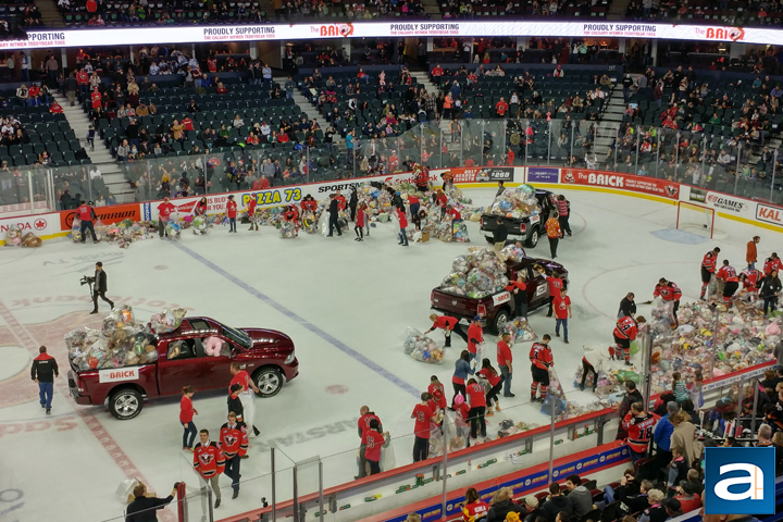 This shot was taken during the Calgary Hitmen's Teddy Toss game. To give some context, fans are encouraged to bring stuffed animals wrapped in bags, and when the Hitmen score their first goal, fans are to throw the stuffed animals down onto the ice, creating a shower of lions, tigers, and bears! Oh my! This shot was taken with HDR mode on, and you can see as everything is quite clearly defined. The reds on the volunteers and hockey players' shirts pop out quite distinctly, as do the many other colors around the ice. The ice does look slightly green, though I think this is partially due to the lighting in the Saddledome. Otherwise, the photo captures a lot of detail, which is pretty much as expected since lighting was quite good here.