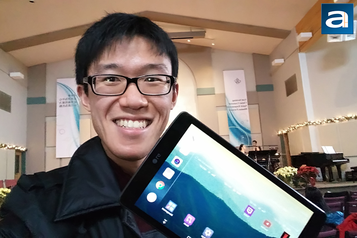 Flipping the camera around, I handed my phone off to the APH Networks' expert of selfies, Editor-in-Chief Jonathan Kwan to try it out. Once again, this shot was taken indoors, with not a whole lot of lighting to be honest. Even though the photo looks pretty lit, this is actually due to the camera making compensations. In his hand is the G Pad III 8.0 because Jonathan wanted a picture with an LG, haha. Joking aside, the front-facing camera is actually pretty good in terms of color reproduction. A bit of noise creeps in, and some softness is seen in the picture, but even so it handles the contrast between the tablet's backlight and the overall room quite well. Colors on the face and in the background are on point, and the camera also easily focuses on the face. Speaking of which, the front facing camera does have facial detection, which helps in auto focusing.