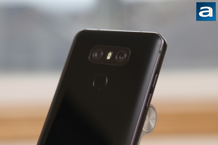 On the back of the phone, you can see the aforementioned Gorilla Glass 5 here. It is a glossy finish, so fingerprints will readily show on the LG G6's back. Even so, the phone is pretty easy to grip to, and the metal frame gives your fingers an anchor point to hold. The back of the phone also houses a couple key features to speak of. First, we have the dual camera setup. Similar to the LG G5, the right camera is the standard 13MP, f/1.8 camera, with optical image stabilization and phase detection auto focus, or OIS and PDAF for short. The left camera is a wide angle, 13MP, f/2.4 camera. Having two cameras in late 2017 on your phone is becoming more and more common, as it can be found on multiple flagship phones. On the other hand, these flagships may swap out the wider angle camera for a telephoto lens instead. A dual LED flash can be found housed in between the two cameras. Underneath this area is the second key feature, which is the fingerprint sensor and power button. Placing your finger on this button will activate the sensor, while pushing it in powers the device on. This fingerprint sensor is quite quick and it learned my fingers in a very short amount of time. Turning the phone on through fingerprint recognition is also fast. Thankfully, there is also no power button wobble I observed on my unit of the LG G5.