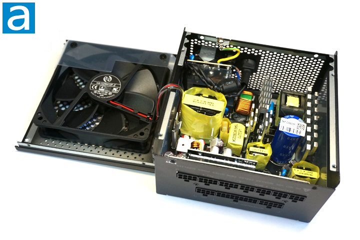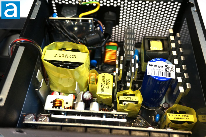 In order to further investigate the design details of the NZXT C650 650W power supply unit, some panel removal is required. It is important to note two important concerns before disassembling any power supply unit. First, certain components, such as the capacitors, may cause an electrical shock if not discharged properly. Second, your ten-year warranty will be voided if the screws on the power supply unit are removed. Therefore, unnecessary disassembling of a power supply unit should be avoided. Once the top panel of the C650 is removed, a closer look of the electronic components can be revealed. The OEM for the power supply is Seasonic, which means excellent quality in my opinion.