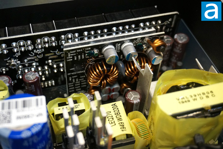 The electrolytic capacitors on the secondary side are also manufactured in Japan, and they are rated at 105c. These polymer capacitors are from any Japanese company as well; they are made by Chemi-Con, FPCAP, and NIC. For a modern power supply unit, the power output from the rectifiers is +12V. Two Nexperia PSMN1R8-40YLC are responsible for generating +12V, and they can provide current up to 100A continuously at 100c. The +12V output of the power supply unit can just directly use the power from the rectifiers. However, the +5V and +3.3V outputs are converted from the +12V output. The conversion functionality is mainly realized by the components on the DC to DC daughterboard. Meanwhile, there is a Weltrend WT7527V supervisor IC to realize over/under current and over/under voltage protection. More information about the parts mentioned in this review can be found from their respective datasheets from the manufacturer's website.