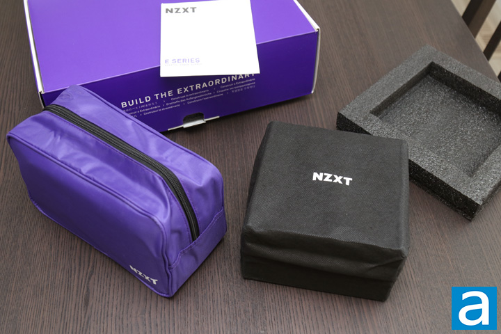 The NZXT E850 850W's retail packaging can be opened by a flap attached at the bottom. Upon opening the box, you will find everything neatly organized. The power supply is placed inside a nylon bag and securely clipped in by two foam brackets. Everything else is located inside a purple nylon zipper bag that looks like a big pencil case. Out of the box, you will receive the E850 850W power supply itself, modular cables, AC power cable, four screws, and a product manual. The bundle is very minimalist; you will not even find a Velcro strap or zip tie.