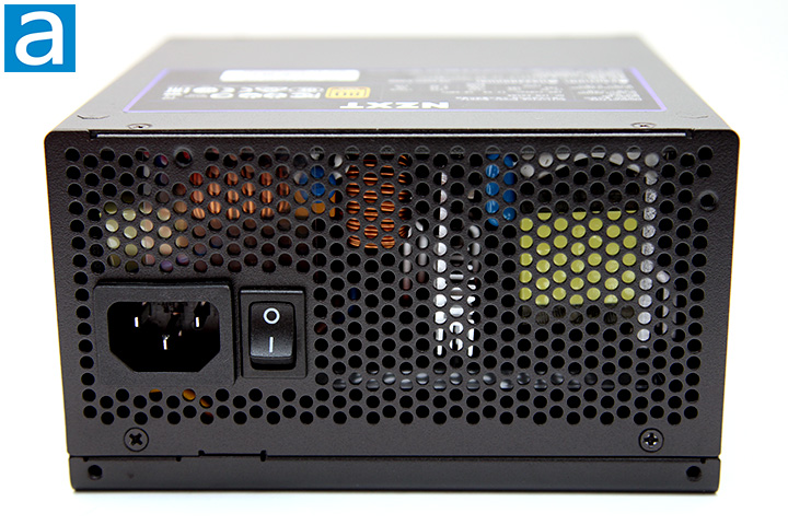 Starting from the back part of the power supply, we have the honeycomb circular mesh design as aforementioned; what you will find here is a horizontally aligned male connector for power input on the western edge along with an on/off switch next to it. The low resistance mesh design is implemented to maximize airflow and minimize air resistance. This is done as heat needs to leave the power supply as easily and efficiently as possible, because the E850 850W incorporates only one 120mm fan at the bottom with no auxiliary fan. It is implemented in a very efficient manner, as the power input block takes up no more than the necessary amount of room physically required. As with all active PFC power supplies, the NZXT E850 850W has an automatic full range (100V-240V) AC line voltage selection, so the user does not have to worry about manually selecting input voltage.