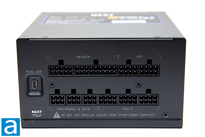 The rear cable connection panel is done nicely. Similar connectors are grouped together and are laid out in a very logical manner. To ensure you know what is going on, they are all grouped and clearly labeled for minimal ambiguity. From the left to right and top to bottom, we have the motherboard 24-pin, two ATX/EPS 4+4 pin, three Molex/SATA, and three PCI Express headers. The motherboard section supports an ATX 24-pin connector by two separate blocks next to each other. A USB header on the very left connects to your motherboard via an internal USB 2.0 header to provide PSU operating information and statistics with NZXT's CAM monitoring software. Incompatible outputs will not physically fit into each other, so I think NZXT has done a great job in this regard. This is a reasonable array of outputs in correspondence amount of connectors on each modular cable, which should be sufficient for casual users and power enthusiasts alike.