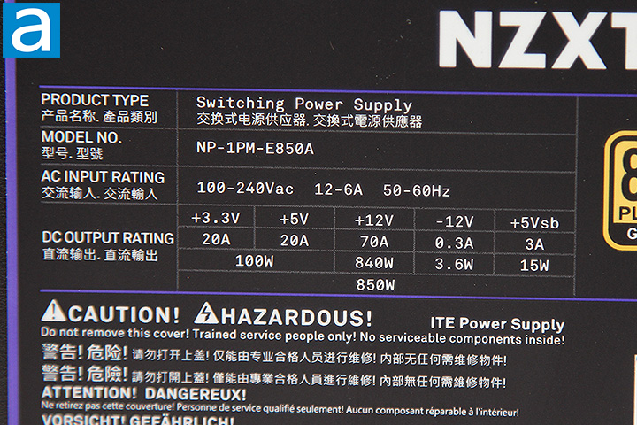 The voltage specification label is located on the top panel of the NZXT E850 850W. There are two main virtual rails. Up to 20A can be delivered via the +3.3V rail for a total of 66W; while the 20A on the +5V rail brings the output to 100W in this area. The total combined output for the +3.3V and +5V rail is 100W. In other words, your power allocation combination must fall within the limits of the listed specifications. Meanwhile, a single powerful +12V rail delivers up to 70A (840W) to reduce operating overhead compared to multiple +12V rails. Overall, the combined power output for the whole NZXT E850 850W is... well, 850W haha. Again, your power distribution in your system must fall within the limits provided -- it must not exceed 66W on the +3.3V rail, 100W on the +5V rail and 100W combined for both, 840W on the +12V rail, and 850W combined between the +12V and +3.3/+5V rails. It does sound a bit confusing to understand how this works at first, but generally speaking, this configuration allows very flexible power demands and should be sufficient to accommodate most users. I have seen higher power outputs in the +3.3V and 5V rails for lower output rated units, but the overall distribution is still reasonable for an 850W power supply.