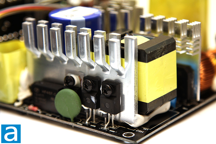 The active PFC circuit featured on the NZXT E850 850W uses two Lite-On Semiconductor GBU1506 bridge rectifiers attached to opposite sides of the first heatsink. At 115V, the maximum rectified forward current capacity with heatsink is 15A each, so you can theoretically pull up to 3450W (15A * 2 diodes * 115V) from the bridge rectifier at 100% efficiency -- of course, this is limited by the fact that it is not 100% efficient, and also neglects the fact that not every component in the system are able to keep up. Further down the line, on the outside of the largest heatsink, we can see two Infineon IPP60R190P6 power transistors. This MOSFET model is certified for up to 12.7A at 100c. A STMicroelectronics STTH8S06 boost diode is placed right next it. Four Greatpower GPT13N50DGN220FP power MOFSET transistors are used as the main switchers on the E850 850W power supply. Each Greatpower GPT13N50DGN220FP MOFSET can deliver up to 13A at 25 degrees Celsius continuously. These transistors present a maximum resistance of 0.49 ohm when turned on according to the manufacturer's data sheet. This on characteristic is called Static Drain-Source On-Resistance, or commonly abbreviated as RDS(on). The more efficient the component is, the lower the RDS(on) value, since it wastes less power with lower resistance.