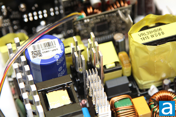 On the primary side, we can see one Japanese brand Hitachi capacitor. 100% Japanese brand capacitors are specified on the marketing material, so this is to be expected. Our 850W version of NZXT's latest E-series power supply incorporates one 680µF x 400V capacitor. It is rated at 105c; whereas more value-oriented power supplies usually use 85c rated capacitors.