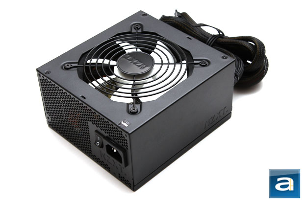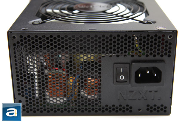 Starting from the back part of the power supply, we have the same familiar honeycomb mesh design like most PSUs with bottom mounted fans; and the standard on/off switch located below the male connector for power input on the western edge. The low resistance honeycomb mesh design is implemented to maximize airflow and minimize air resistance. This is done as heat needs to leave the power supply as easily and efficiently as possible, because the NZXT HALE82 750W incorporates only one 120mm fan at the bottom, with no auxiliary fans. I think this design is acceptably efficient for the most part, except something makes me wonder why they are blocking off nearly a third of the possible mesh space around the connector panel. The extra space around the AC power input and switch is probably not necessary; that's not to mention that NZXT's logo will end up being upside-down for most standard case installations. That aside, as with most new power supplies, the NZXT HALE82 750W has an automatic full range (100V-240V) AC line voltage selection, so the user does not have to worry about manually selecting input voltage.