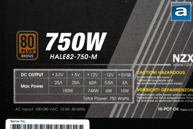 The NZXT HALE82 750W is 80 Plus Bronze certified, as its name implicitly suggests. This means that it is certified to be at least 82%, 85%, 82% efficient at 20%, 50%, and 100% load, respectively. Higher certification for 115V internal non-redundant power supplies at press time include 80 Plus Silver, Gold, and Platinum.