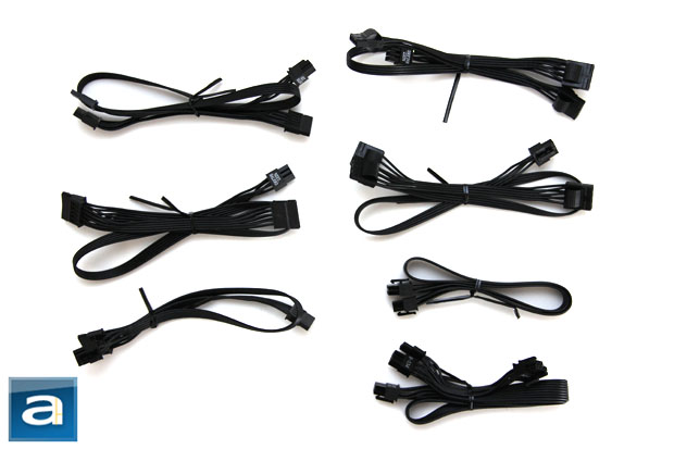 A total of seven modular cables are included out of the box. All modular cables are flat and easy to bend, making them extremely easy to work with. Non-modular cables are nicely sleeved for the end-user. All cables are 18 AWG, which is a bit thinner than 16 AWG cables commonly found with motherboard and PCI Express connectors.