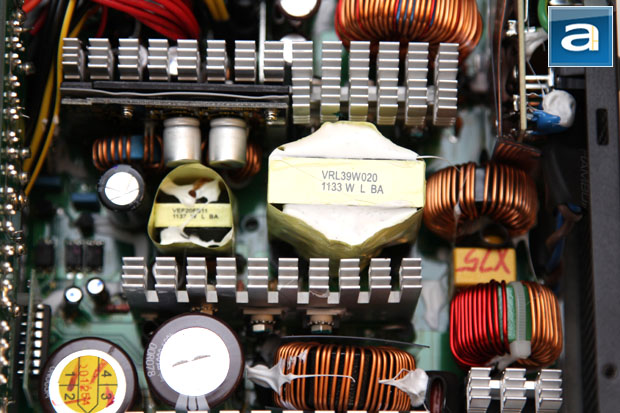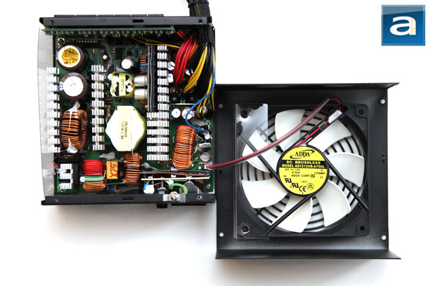 The DC-to-DC converter has one ANPEC APW7159 synchronous buck PWM controller and six Diodes Inc. SBR30A50CT rectifiers for its rectification and DC +12V output process. The SBR30A50CT's maximum drain current is 15A at 25c, peak forward surge current of 260A at 25c, and maximum forward voltage drop of 0.55V. The DC to DC converter process is executed on a vertically oriented PCB behind the heatsink on the secondary side with seven Infineon chips. Meanwhile, a Silicon Touch PS223 IC provides over/under current and over/under voltage protection.