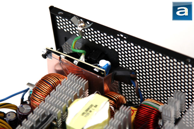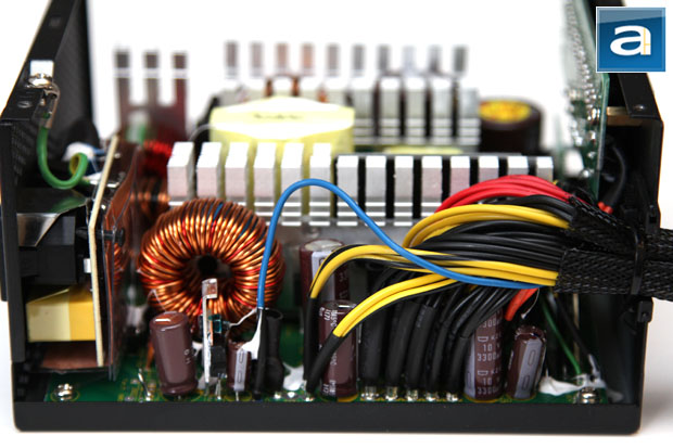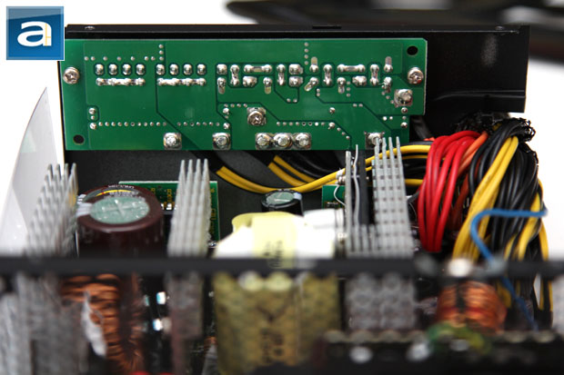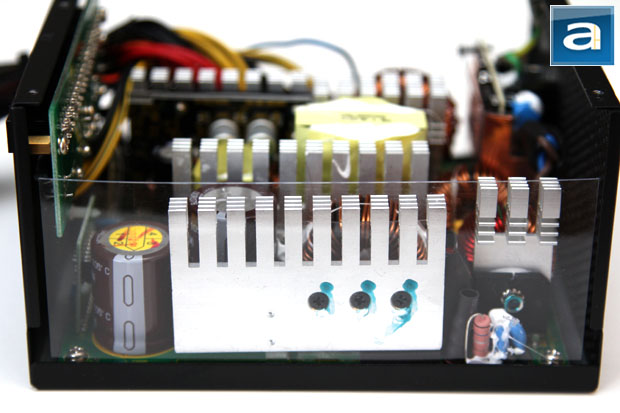 Disassembling the NZXT HALE82 750W is very straightforward. Simply remove four screws, and you are on your way. Built by renowned manufacturer Seasonic, our photo above shows an overhead view of the its internal components. At first glance, the build quality appears to be excellent, as one would expect from the OEM. Its components are well organized for optimal cooling and reduced heat congestion as well. There are four heatsinks inside the power supply, with all of them finned at the top. Three of them are quite large with a smaller one on the side, as you can see in our photo above.