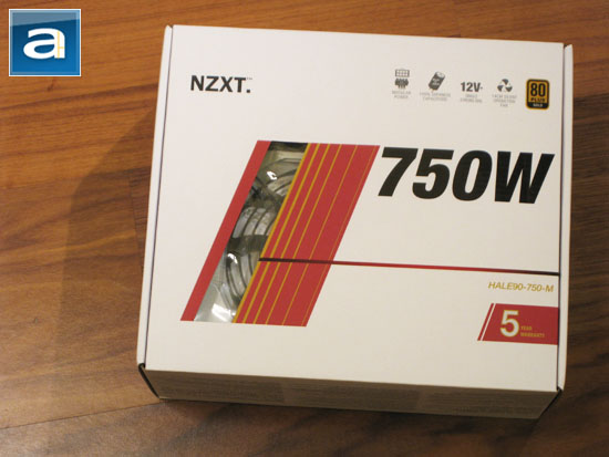 One of the most distinguishing features of NZXT's HALE90 power supply is its white colored enclosure -- and its packaging rightfully reflects that to the consumer. Our retail box features a clear white design with a small window near the middle to allow the end user to take a peek at the power supply itself; the window is surrounded by an array of red stripes to capture a potential retail customer's attention, as well as giving the retail package some style. Its maximum wattage specification is printed quite boldly across the front -- that is 750W in our particular case (The HALE90 is available from 550W up to 1000W). Other than that, NZXT's logo is found in the upper left corner, with five icons highlighting its modular power connectors , 100% Japanese capacitors, single 12V rail, 140mm fan, and 80 Plus Gold certification situated next to each other on the right. The NZXT HALE90 750W also comes with a 5-year warranty.