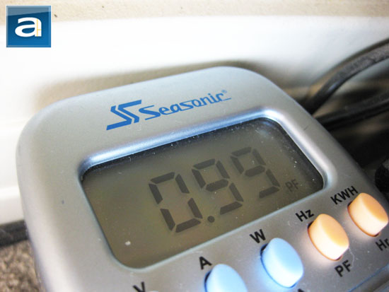 Active power correction is important to correct AC load line loss. In AC power, there are three components to it; as there is a phase difference between current and voltage. This makes up the power triangle, which consists of the following: Average usable power (P, measured in watts), reactive power (Q, denoted as VA-R), and total power (S, written as VA). While they all have the same physical units, it is not the same thing as aforementioned. What we want is the average usable power -- with as little wasted reactive power as possible. The total power provided over the AC line is the magnitude of the two combined (sqrt(P^2+Q^2)). Power factor can then be easily calculated by P/S. The ideal value is 1.00, and this is where active PFC comes in. A nominal load of 168W on the NZXT HALE90 750W had the power factor between 0.96 and 0.97. As the load increases to around 200W, the power factor corrects to 0.99, as shown in our photo above.