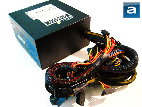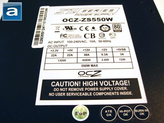 Located at the top of the power supply is the rail information label; which conveniently displays various certifications that the OCZ ZS Series 550W has obtained as well -- most notably, the 80 Plus Bronze certification. This means this power supply is certified to be at least 85% efficient at 50% load, and 82% efficient at 20% and 100% load, respectively. Combined DC output is rated at a maximum of 550W for continuous use, as denoted by its OCZ ZS '550W' name, haha. The +3.3V and +5V rail's output comes to a 130W combined maximum. Independently, the +3.3V rail's theoretical maximum output is 72.6W, and the +5V rail's theoretical maximum output is 110W. For the +12V rail, it is a large single rail running at 38A. Using this to calculate the wattage, the +12V rail's independent theoretical maximum is 456W. Using all the combinations and restrictions listed above, the total capable power output is 550W as aforementioned. All of the calculations were done using the standard P=IV formula.