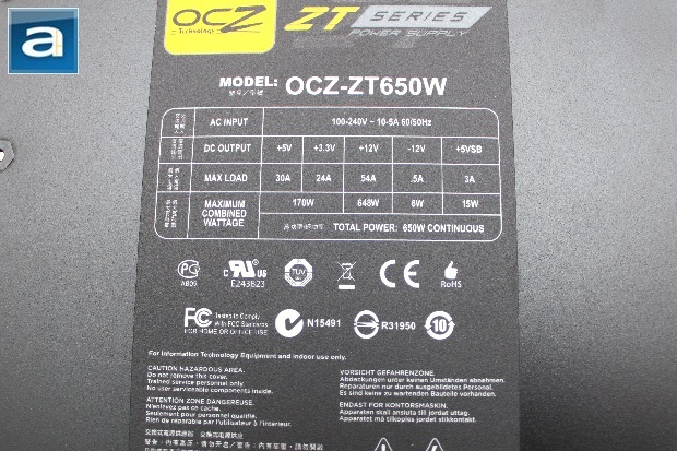 The OCZ ZT Series 650W is 80 Plus Bronze certified, which means that it is certified to be at least 82%, 85%, 82% efficient at 20%, 50%, and 100% load, respectively. Higher certifications available at press time would include the 80 Plus Silver, 80 Plus Gold, and 80 Plus Platinum.
