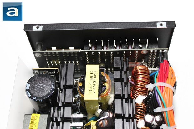 The active PFC circuit uses two SiPower T10KB60 rectifying bridges; each supports up to 10A of current at 100c, and are attached to the heatsink. These are controlled by the Champion CM6800 PFC/PWM controller. At 115V, the maximum rectified forward current capacity is 10A. From doing the math, you can theoretically pull up to 2300W from the bridge rectifier at 100% efficiency, but of course, nothing is ever perfectly efficient. On top of that, not every component in the power supply can keep up the workload. Two Fairchild Semiconductor FDA24N50 power MOFSET transistors are used on the active PFC circuit, each can deliver up to 14A at 100c or 24A at 25c in continuous mode, or 96A at 25c in pulse mode. These transistors have a maximum resistance of 0.19 ohm when turned on, according to the manufacturer's data sheet. This feature is characterized as Static Drain-Source On-Resistance, or commonly abbreviated as RDS(on). The lower the value, the more efficient the component is, as it wastes less power with less resistance.