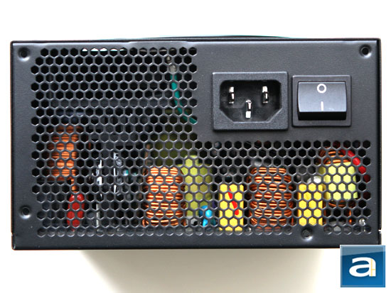 Starting from the back part of the power supply, we have the same familiar honeycomb mesh design like most PSUs with bottom mounted fans; and the standard on/off switch located on the right side of the male connector for power input at the upper right corner. The low resistance honeycomb mesh design is implemented to maximize airflow and minimize air resistance. This is done as heat needs to leave the power supply as easily and efficiently as possible, because the OCZ ZX Series 850W incorporates only one 140mm fan at the bottom, with no auxiliary fans. However, I think the design can be a little more efficient, as the power input and switch panel occupies nearly a quarter of the rear exhaust area. Reducing the size of the on/off switch would probably help. As with most new power supplies, the OCZ ZX Series 850W has an automatic full range (100V-240V) AC line voltage selection, so the user does not have to worry about manually selecting input voltage.