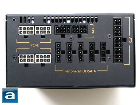 The rear cable connection panel is done nicely. Similar connectors are grouped together; labeled in gold colored text for the convenience of the end user. Situated vertically near the right is the ATX 24-pin output. Set towards the inside of a chassis in standard configuration, this actually makes perfect sense for hardcore cabling enthusiasts like yours truly. At the top are two 8-pin CPU power outputs (Although most users should use no more than one of these). Under that, we have an array of five Molex/SATA compatible connectors. Finally, on the left side, is a two by two matrix for a total of four 8-pin PCI Express power outputs. Since the EPS 8-pin and PCIe 8-pin will physically fit into each other's sockets, OCZ color coded them for differentiation. This works, but an incompatible socket between the two will be better in my opinion. Meanwhile, a small ventilation opening can be found at the top. This generous array of available connectors should be more than sufficient for casual users and power enthusiasts alike.