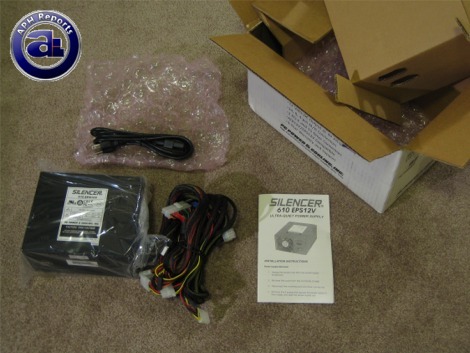 The majority of the box's weight comes from the power supply itself. Out of the box and removing the partitions, you will receive a unit of PC Power & Cooling's Silencer 610W itself, along with a brief manual and a power cable enclosed in bubble wrap. Absolutely no frills. You buy a power supply, and you will get a power supply. According to many, the PC Power & Cooling Silencer is also a very solid power supply in every aspect as well.