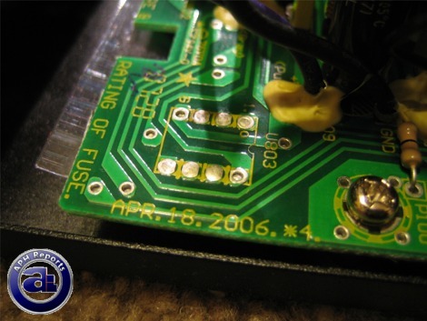 A shot at the back of the power supply -- the AC power input as well as the on/off switch is located on the other side. A ferrite bead (Black) can be seen above in the main power cable lead-in. A single ceramic capacitor, iron ferrite coil, as well as a metalized polyester capacitor are all packed behind the board. The PC Power & Cooling Silencer 610W automatically selects voltage, as mentioned earlier.