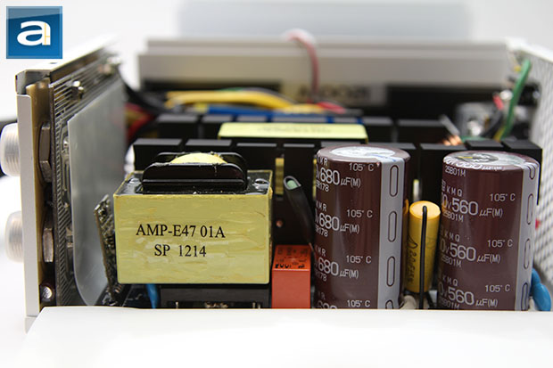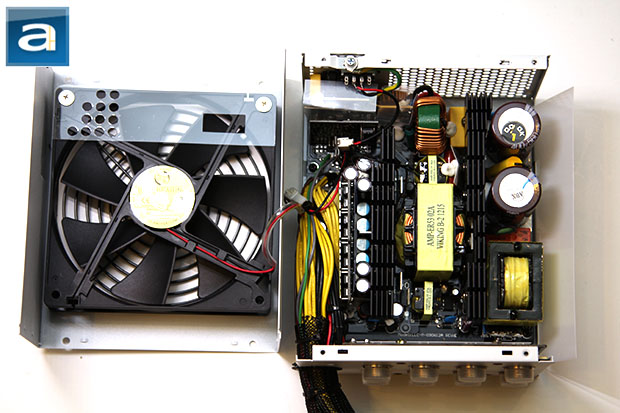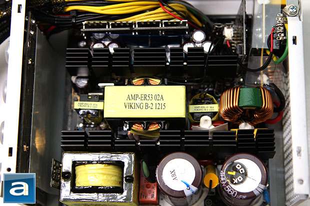 Disassembling the PC Power & Cooling Silencer Mk III 1200W is quite straightforward, with the removal of four screws. Built by Super Flower Computer, our photo above shows an overhead view of its internal components. At first glance, the build quality appears to be pretty good, as one would expect from the OEM in some of their latest designs. Its components are well organized for good cooling and reduced heat congestion as well. There are two main heatsinks inside the power supply; they are all quite low profile and flat at the top.