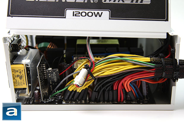 At the back, we have a large daughterboard covering the entire rear panel for the modular cable sockets with thick traces. After the secondary stage, all the wires lead into the secondary board, as shown in our photo above. A bunch of capacitors are built into the board for further filtering. The output connector configuration can be seen on the previous page. Overall, the internal build quality of PC Power & Cooling's Silencer Mk III 1200W power supply is pretty good -- some parts are way overbuilt for what it is for. Components are arranged nicely for good cooling with minimal wires running around inside, and solder points are fairly clean. I would say the PC Power & Cooling branded, Super Flower built Silencer Mk III 1200W is very commendable with regards to the selection of components used under the hood.
