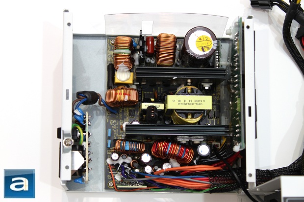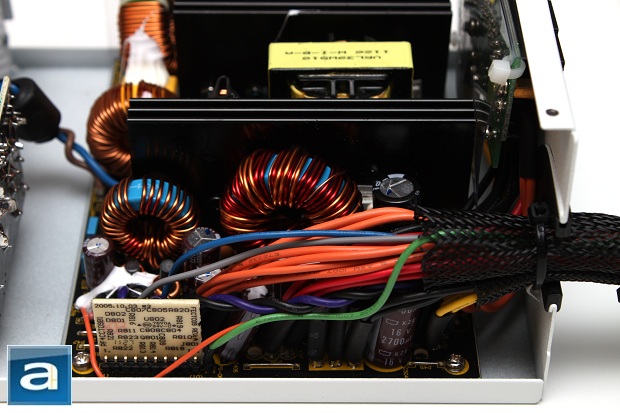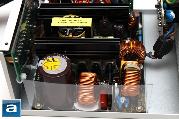 As always, having power supplies inspected here at our APH Networks labs means voiding the warranty is a must. If for any reason you decide to give it a shot, just be sure to open it up only when the warranty is over, as the manufacturer will decline to help you if the seal is broken within the warranty period. We void the warranty to take a look inside, so you don't have to worry about yours. As you can see from our photo above, it shows an overhead view of the PSU itself. The components are spaced out with some quite a bit of room to spare for the best possible cooling with the least amount of heat congestion. The PCB inside the Silencer Mk III is nicely colored black, while generally speaking, PCBs are not. It is just an aesthetics thing, haha. There are only two black painted finned anodized aluminum heatsinks under the hood as well. This simple heatsink arrangement along with such a configuration of interior components allows for lower airflow impedance benefit.