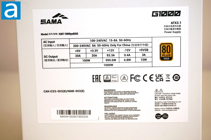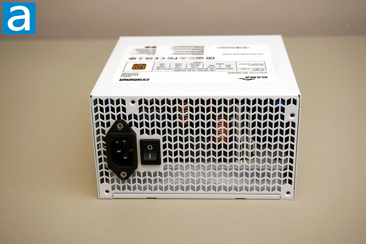 Now, let us move on to the back of the power supply unit. In the photo, we can see the power input socket and power switch, both of which are essential components for operation. The power input plug follows a standard design, meaning users can conveniently reuse a compatible power cord from other equipment if needed. This adds flexibility and eliminates the hassle of finding a specialized cable. Just like the bottom side, almost the whole back side of SAMA G1000 is grille for maximum airflow. For the input, the SAMA G1000 1000W has an automatic full range 100V to 240V AC line voltage selection like all active PFC power supplies, so the user does not have to worry about manually selecting input voltage.