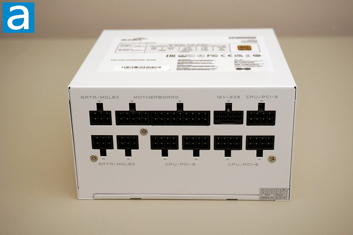 The power sockets on this PSU are well-labeled and easy to identify, ensuring a smooth and intuitive installation process. The layout follows a familiar two-row pattern, making it easy for users to find the correct slots for each cable. On the top row, there is a 20+4-pin connector for the motherboard power, which is a universal requirement for all ATX motherboards. To the right hand side of the motherboard socket, there is one PCIe 5.1 12V-2x6 connector and one PCIe 6+2 pin/8-pin EPS connectors. The PCIe 5.1 12V-2x6 port is capable of delivering up to 450W to high-end GPUs. To the left of the motherboard connector, we have one 6-pin SATA/Molex outputs. On the bottom row, there are two more 6-pin SATA/Molex ports, allowing connection of up to three SATA cables in total for storage devices and peripherals. Sharing the same socket design for both PCIe and ATX 4+4 pin connectors allows simplified cable connections at the PSU side. For example, the ATX 4+4 pin and PCIe 8-pin connectors can be plugged in to either of the PCIe 6+2 pin/8-pin EPS connectors, while on the motherboard side, only the correct connectors are physically matched, reducing the risk of damage during installation.