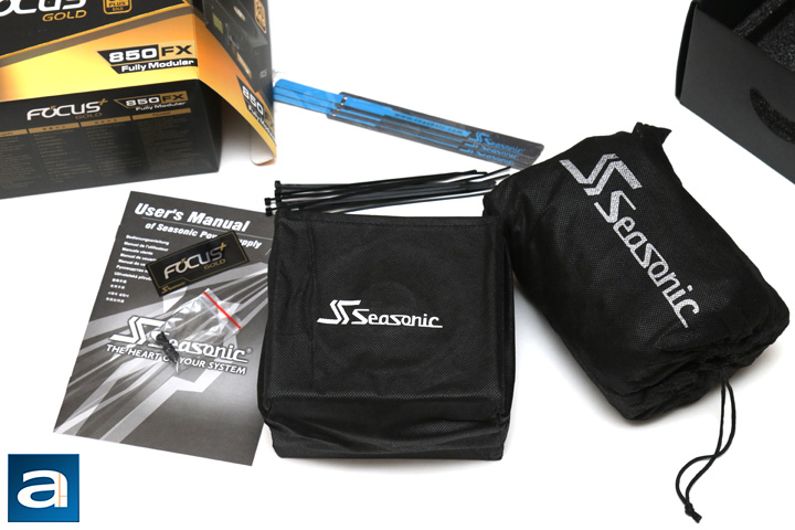 The Seasonic FOCUS Plus 850 Gold 850W's retail packaging can be opened by a flap attached on the right. Upon opening the box, you will find everything neatly organized. The power supply is located inside a fabric bag on the right, with the cables in a drawstring bag on the left. All the other accessories are inside a resealable clear plastic bag. Out of the box, you will receive the FOCUS Plus 850 Gold 850W power supply itself, modular cables, AC power cable, Velcro straps, zip ties, four screws, case badge, sticker, and a manual. Despite being a cheaper unit than Seasonic's flagship lineup, we pretty much have the same accessories here, which is great to see.