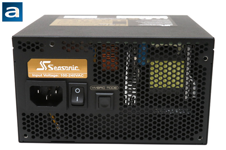 Starting from the back, we once again have the honeycomb pattern. This uniform design is generally favored not for its aesthetics, but rather for maximizing airflow while minimizing air resistance. The back vents play an essential role in allowing heat to flow out the back, and having better airflow means it will get out as efficiently as it can. Most modern power supplies have an automatic full range (100V-240V) AC line voltage selection, so you will not need to manually flip an additional switch, and this product is no exception. Therefore, the back has a single power switch and a standard power input. Thankfully, this is not a C20 receptacle, like the ones we have seen on some power supply units. We also have a push button switch with a label of "Hybrid Mode". As the name implies, this switch enables the hybrid silent mode for the fan. According to Seasonic, when this switch is not pressed, the fan will remain off at loads less than 30% of the maximum 850W.