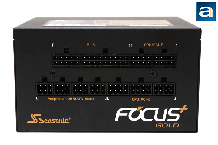 From the top of the photo here, you can see the Seasonic logo smacked in the middle with horizontal bars to allow air to the fan. These metal bars running across the 120mm internal fan act as a grille to stop larger debris and objects from entering, all while not impeding airflow significantly. Otherwise, the sides of the power supply are finished in a smooth black look, with some small but noticeable engraved accents around the box. The sides show off the FOCUS Plus Gold branding. At the back, we have exhaust vents in a standard honeycomb pattern. This allows excess heat to leave out the back of the power supply. The external casing of the power supply is held together with four screws at the top near the fan, with one screw having a warranty seal over it. The only way to get inside this unit is to void the ten year warranty, which is not advisable to do.