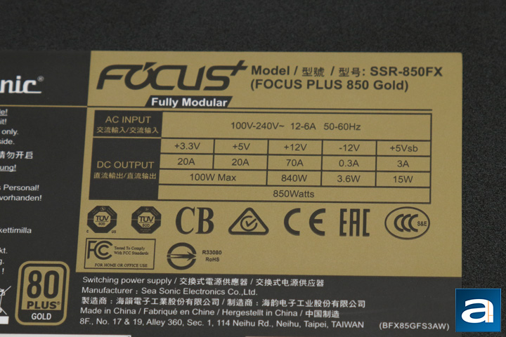 The voltage specification label for the Seasonic FOCUS Plus 850 Gold 850W is on the opposite side of the fan. There are two main virtual rails. Up to 20A can be delivered via the +3.3V rail for a total of 66W. The +5V rail can deliver 20A too, bringing the output to 100W in this area. The total combined output for the +3.3V and +5V rail is 100W. In other words, your power allocation combination must fall within the limits of the listed specifications. Meanwhile, a single powerful +12V rail delivers up to 70A (840W) to reduce operating overhead compared to multiple +12V rails. Overall, the combined power output for the whole FOCUS Plus 850 Gold 850W is an unsurprising 850W. There is a 10W difference between the +12V line and the total output. Again, your power distribution in your system must fall within the limits provided -- it must not exceed 66W on the +3.3V rail, 100W on the +5V rail and 100W combined for both, 840W on the +12V rail, and 850W combined between the positive rails. All these confusing numbers aside, this configuration allows for flexible power demands. It should be sufficient to accommodate most users, but it is interesting to see the lower power output on both the +3.3V and +5V lines. Even so, the overall distribution is pretty reasonable for an 850W power supply.