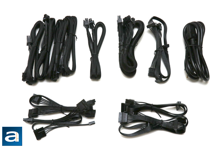 A total of eleven modular cables are included out of the box, plus one small adapter. All of the peripheral cables, including the SATA, Molex, and Floppy adapter are flat ribbon cables, while the motherboard, CPU, and PCI-E cables are sleeved with black webbing. The flat-ribbon cables are generally quite easy to bend, but the braided cables are a bit stiffer. It should be noted some the braided cables have in-cable capacitors, which make them a bit less flexible. These wires are 18AWG, which should be able to handle most high currents found through PCI Express and ATX/EPS connections.