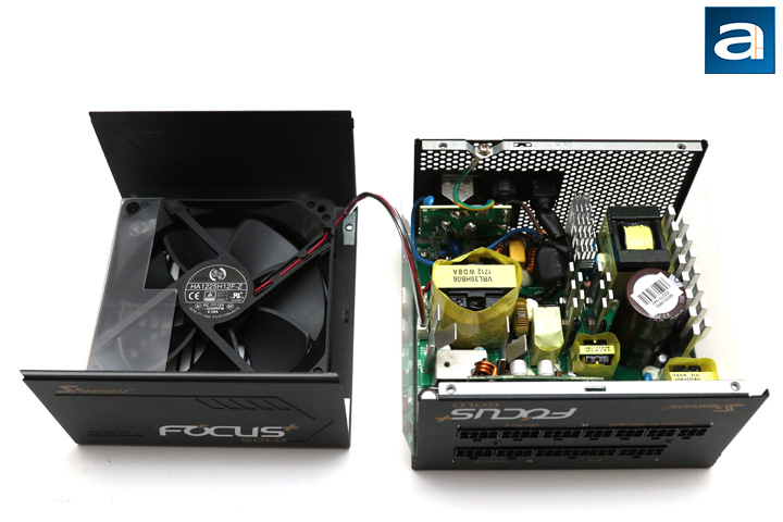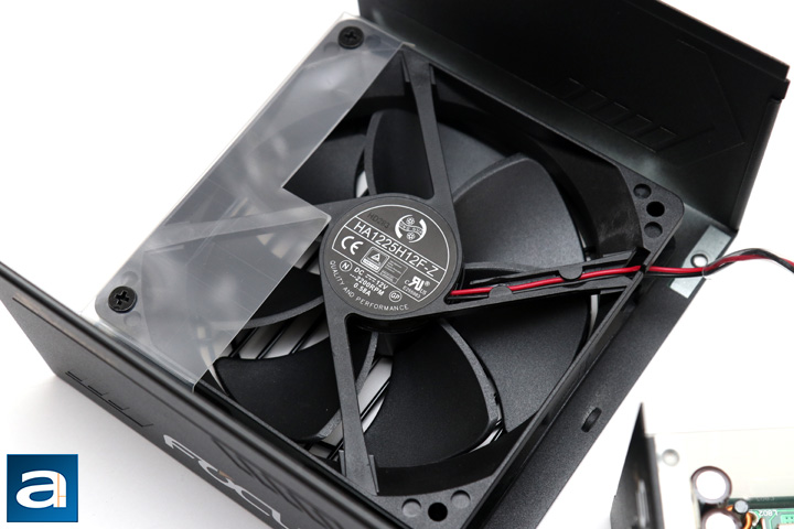 Speaking of cooling, the last component to look at is an important one, as it draws in air to let all these small components breathe easy. This is the Hong Hua fan connected to the mainboard of the power supply. It should be noted this is a semi-passive power supply, as the fan only kicks in at higher loads. Further research of the HA1225H12F-Z shows this fan operates at 12V and 0.58A, with a speed of 2200RPM, and with fluid dynamic bearings for quieter operation.