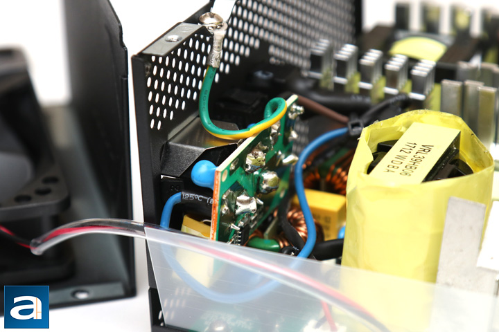 The transient filter stage is the first input stage of any computer power supply, so we will take a closer look at this first. From here, there are two ferrite coils and one metal oxide varistor. One X-capacitor can be found here at the AC receptacle in addition to two Y-capacitors. Another set of one X and two Y-capacitors can be found near the area, making for more than twice the amount of X and Y capacitors than recommended. In addition, the MOV being present here is good, as they are intended to protect your power supply from AC line voltage spikes.