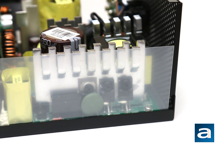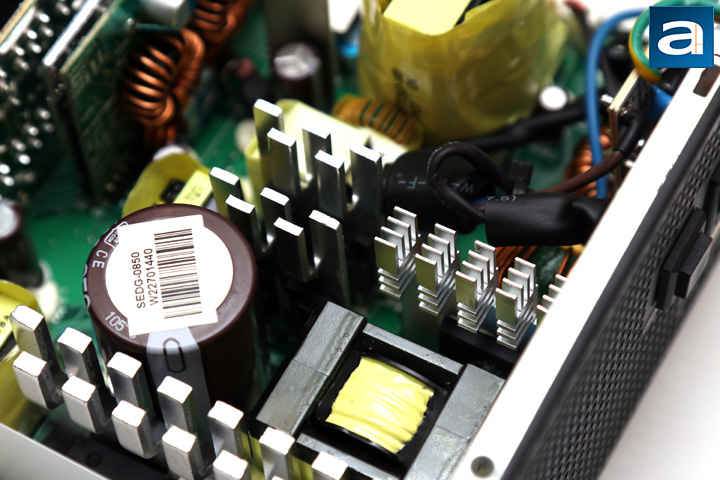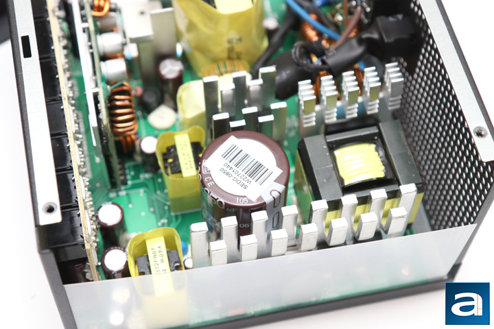 At the back, we have a large daughterboard covering the entire rear panel. This is where the modular cable sockets go. Layout of the output connectors can be found on the previous page. Seasonic has done a good job in ensuring quality is not sacrificed here. Soldering is excellent overall, which is nothing less than expected for this OEM. Component selection too is great with a decent layout for cooling. In addition, with the number of heatsinks in this unit, I doubt cooling will be an issue.