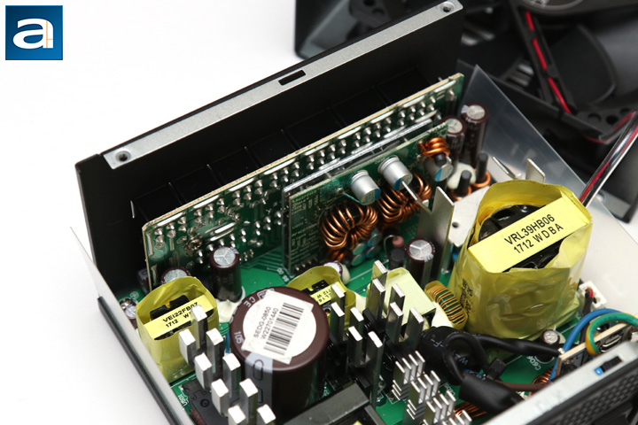 As for the secondary side, there are quite a few more Japanese capacitors made all from Nippon Chemi-Con, including both the electrolytic and polymer capacitors. The electrolytic capacitors are all rated at least 105c. As with modern high efficiency power supplies, all rectifiers produce the +12V out -- while the +5V and +3.3V outputs are generated from the +12V output using a DC to DC converter within the power supply unit. The +12V output is regulated by four Nexperia, formerly known as NXP Semiconductors, PSMN2R6-40, cooled by the chassis. Drain source voltage is rated at 40V, with a continuous drain current of 100A at 25c. An RDS(on) value of 0.0028 ohm maximum and 0.002 ohm typical are provided. The +5V and +3.3V rails are powered by components on a daughterboard, which unfortunately cannot be viewed due to a metal heatsink being directly attached here. Finally, a Weltrend WT7527V IC provides over/under current and over/under voltage protection. The datasheets for all components mentioned in this review can be found on their respective manufacturer's websites.