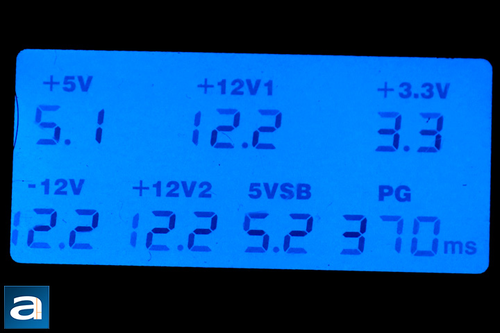 Voltages with minimal load are generally accurate, which is a basic requirement of power supplies out of the box. In this situation all are within 4%. The PG (Power Good) delay seems to be well within its rated range and general power supply standard at 370ms.
