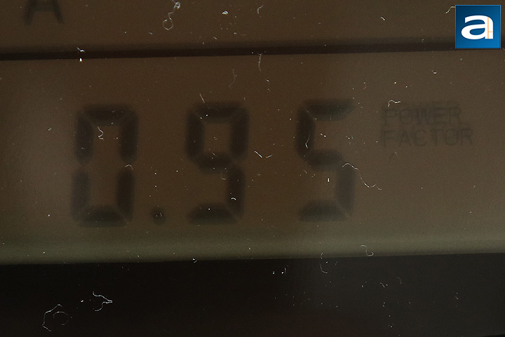 Active power correction is important to correct AC load line loss. In AC power, there are three components to it as there is a phase difference between current and voltage. This makes up the power triangle, which consists of the following: Average usable power (P, measured in watts), reactive power (Q, denoted as VA-R), and total power (S, written as VA). While these components all measure power, they are not the same as each other. What we want is the average usable power, with as little wasted reactive power as possible. The total power provided over the AC line is the magnitude of the two combined (sqrt(P^2+Q^2)). Power factor can then be easily calculated by P/S. The ideal value is 1.00, and this is where active PFC comes in. Under nominal loads, the power factor value of the Seasonic FOCUS Plus 850 Gold 850W was at 0.95, indicating that the active PFC function is working well.