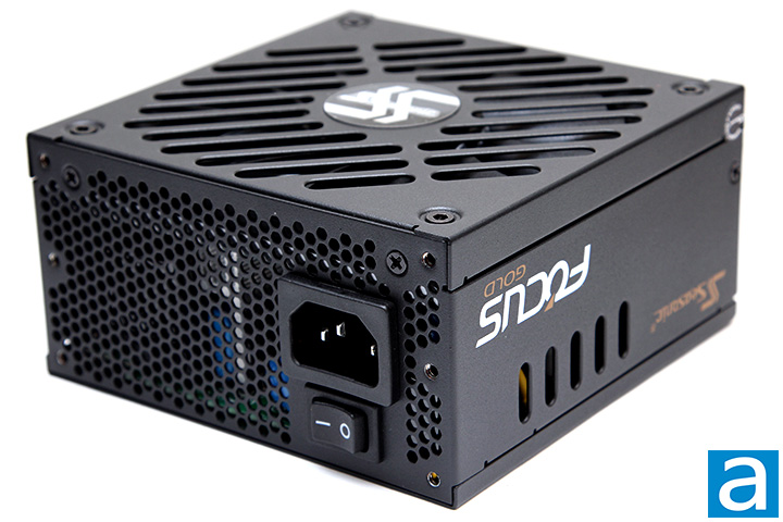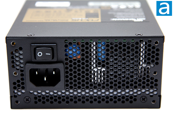 Starting from the back part of the power supply, we have the honeycomb circular mesh design as aforementioned; what you will find here is a horizontally aligned male connector for power input on the western edge along with an on/off switch next to it. The low resistance mesh design is implemented to maximize airflow and minimize air resistance. This is done as heat needs to leave the power supply as easily and efficiently as possible, because the FOCUS SGX-650 incorporates only one 120mm fan at the bottom with no auxiliary fan. It is implemented in a very efficient manner, as the power input block takes up no more than the necessary amount of room physically required. As with all active PFC power supplies, the Seasonic FOCUS SGX-650 650W has an automatic full range (100 to 240V) AC line voltage selection, so the user does not have to worry about manually selecting input voltage.