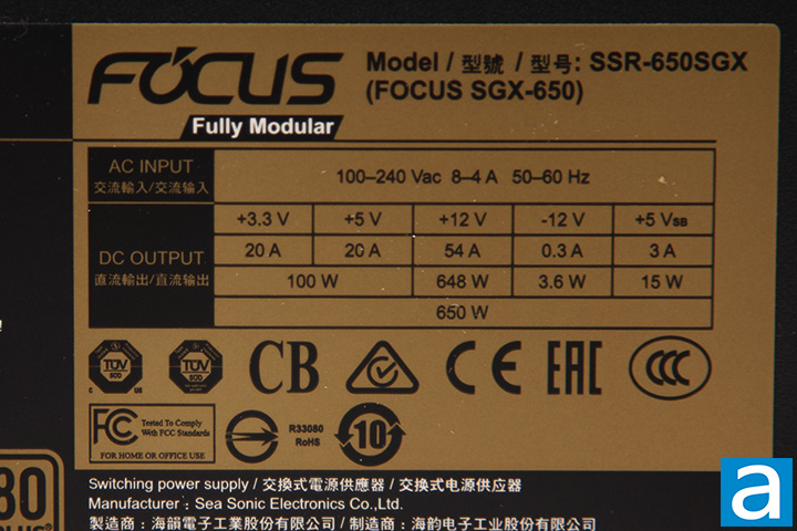 The voltage specification label is located on the top panel of the Seasonic FOCUS SGX-650 650W. There are two main virtual rails. Up to 20A can be delivered via the +3.3V rail for a total of 66W; while the 20A on the +5V rail brings the output to 100W in this area. The total combined output for the +3.3V and +5V rail is 100W. In other words, your power allocation combination must fall within the limits of the listed specifications. Meanwhile, a single powerful +12V rail delivers up to 54A (648W) to reduce operating overhead compared to multiple +12V rails. Overall, the combined power output for the whole Seasonic FOCUS SGX-650 650W is... well, 650W haha. Again, your power distribution in your system must fall within the limits provided -- it must not exceed 66W on the +3.3V rail, 100W on the +5V rail and 100W combined for both, 648W on the +12V rail, and 650W combined between the +12V and +3.3/+5V rails. It does sound a bit confusing to understand how this works at first, but generally speaking, this configuration allows very flexible power demands and should be sufficient to accommodate most users. The overall distribution is very reasonable for an 650W power supply.