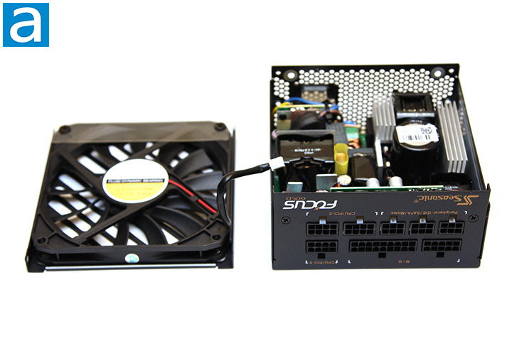 Lastly, we see a 120mm fan that provides cooling to the Seasonic FOCUS SGX-650 650W's internal components. It is connected to the mainboard using a 2-pin connector. A 120mm fan is the largest fan you can possibly fit in an SFX power supply, and it is beneficial in most cases in providing lots of airflow at lower speeds for quiet operation. Globe is the fan OEM, with S1201512HB as the model number, as shown in our photo above. Further research indicates the S1201512HB is a sleeve bearing fan specified at 0.45A for a maximum of speed of 2200 RPM. Fans with sleeve bearings generally have much shorter lifespans compared to ball or fluid dynamic bearings bearing fans, but they are the quietest. Since the Seasonic FOCUS SGX-650 650W has a hybrid fan, the S1201512HB is probably off most of the time, rendering this an acceptable application.