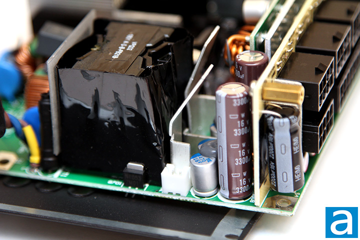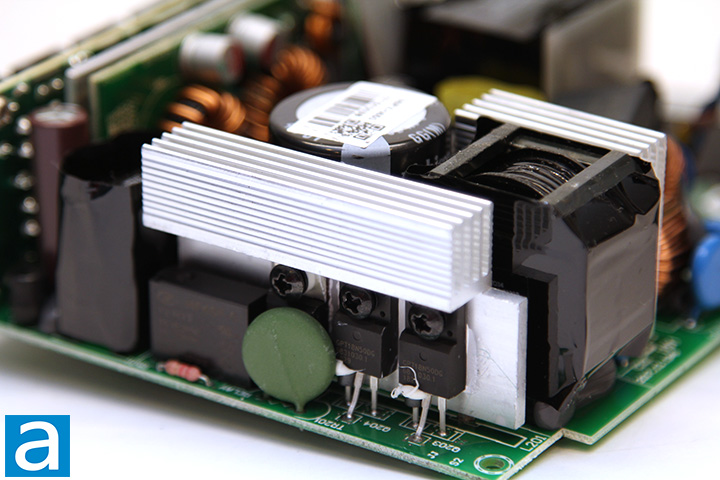 The active PFC circuit featured on the Seasonic FOCUS SGX-650 650W uses one Lite-On Semiconductor GBU1506 bridge rectifier attached to the first heatsink. At 115V, the maximum rectified forward current capacity with heatsink is 15A each, so you can theoretically pull up to 1725W (15A * 1 diode * 115V) from the bridge rectifier at 100% efficiency -- of course, this is limited by the fact that it is not 100% efficient, and also neglects the fact that not every component in the system are able to keep up. Further down the line, on the smaller heatsink, we can see two Infineon IPP60R190P6 power transistors. This MOSFET model is certified for up to 12.7A at 100c. A STMicroelectronics STTH8S06 boost diode is placed right next it. Two Greatpower GPT13N50DGN220FP power MOFSET transistors are used as the main switchers on the FOCUS SGX-650 650W power supply. Each Greatpower GPT13N50DGN220FP MOFSET can deliver up to 13A at 25 degrees Celsius continuously. These transistors present a maximum resistance of 0.49 ohm when turned on according to the manufacturer's data sheet. This on characteristic is called Static Drain-Source On-Resistance, or commonly abbreviated as RDS(on). The more efficient the component is, the lower the RDS(on) value, since it wastes less power with lower resistance.