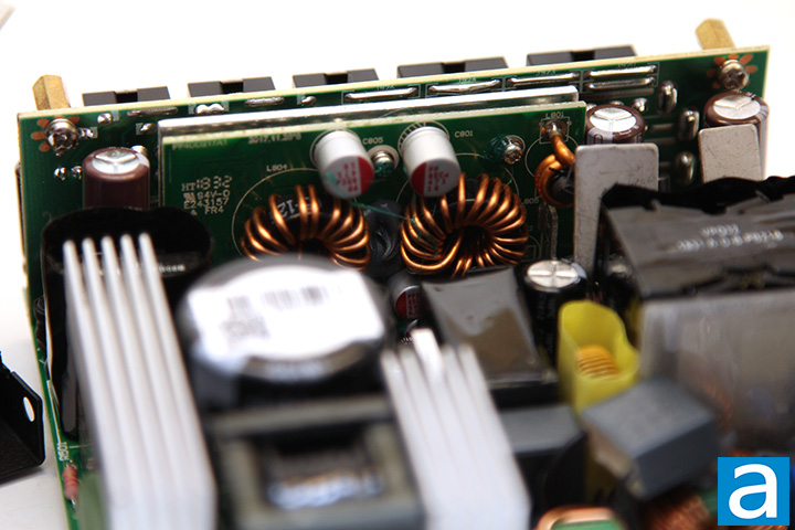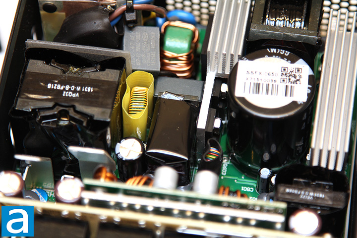 At the back, we have a large daughterboard covering the entire rear panel for the modular cable sockets. All modular sockets at the bottom are soldered directly to the main PCB after the secondary stage to reduce power transmission loss. The output connector configuration can be seen on the previous page. Overall, the internal build quality of Seasonic's FOCUS SGX-650 650W power supply is excellent -- something we would expect from a Seasonic built unit. Components are arranged very well for optimal cooling with minimal wires running around inside, and solder points on its green PCB is quite clean in general. I would say the Seasonic FOCUS SGX-650 650W is generally very good with regards to the selection of components used under the hood; appropriate for its performance class.