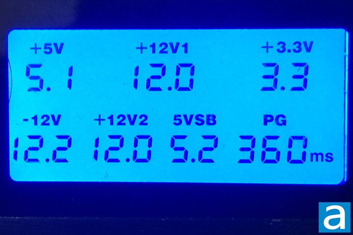Voltages with minimal load are generally accurate, which is a basic requirement of power supplies out of the box. In this situation, all are within 2%. The PG (Power Good) delay seems to be well within its rated range and general power supply standard of 360ms.