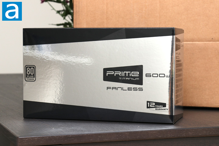 Much like other Seasonic power supplies we have seen, such as the PRIME Ultra Titanium 850W, we have a similar box with a mirrored finish on the front. This is specific to Seasonic's PRIME and PRIME Ultra Titanium series of power supplies. I think the mirrored finish looks really nice, though it makes taking photos of it without getting myself in the photo a bit tricky. As you can see, the one difference of this box is the "Fanless" denotation on the front. Along the sides of the box are some specifications about the unit and the included cables. The front also shows off one nice thing, which is the included twelve years of warranty with the Seasonic PRIME 600 Titanium Fanless.